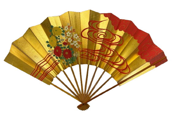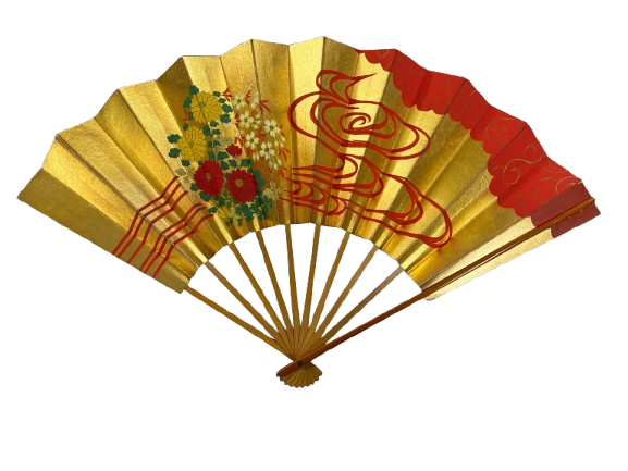 An exquisite folding fan crafted by Jumatsuya Fukui, the prestigious Kyoto atelier celebrated for its mastery of gold-leaf sensu.