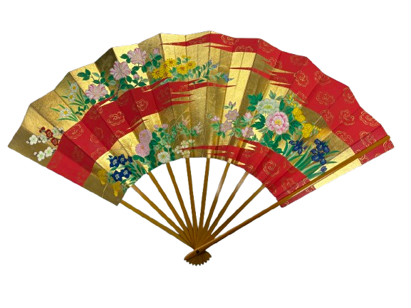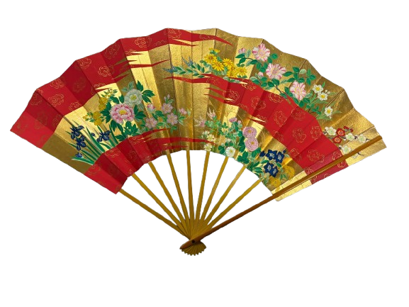 A luxurious hand-painted folding fan crafted by Jumatsuya Fukui, one of Kyoto’s most distinguished fan ateliers known for its mastery of gold-leaf design and refined aesthetics.
