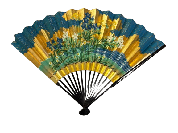 This fan, titled “Midnight Blossoms,” harmoniously combines a deep midnight blue background with glowing gold clouds and delicate bellflowers (kikyō) painted in vivid hues. The contrast between the radiant gold and the serene blue evokes the calm beauty of a moonlit garden in summer.