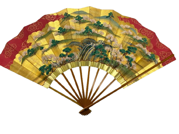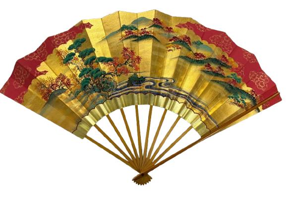 A magnificent double-sided folding fan handcrafted by Jumatsuya Fukui, a premier Kyoto atelier celebrated for its refined traditional artistry.