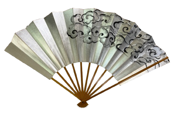 A refined Japanese Mai-sen, elegantly hand-painted with motifs of flowing waves and graceful clouds over a lustrous silver background .