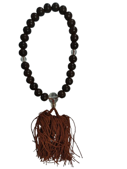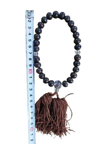 This traditional Japanese Buddhist prayer bead set (Juzu / Nenju) features smooth dark wooden beads combined with clear accent beads and a large central bead.